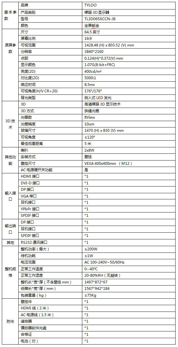 産品規格參數(shù) TL3D065XCCN-JB裸眼3D顯示器(qì)産品規格書(shū)